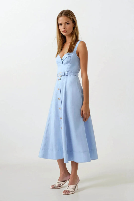 Midi Dress with Belted Waist and Half Sleeves - Light Blue