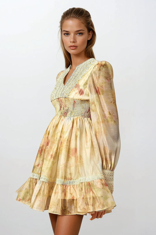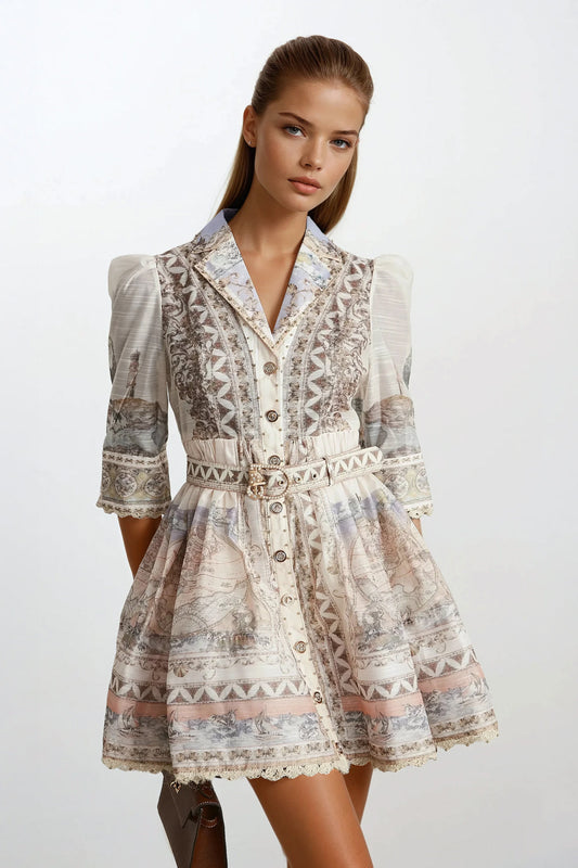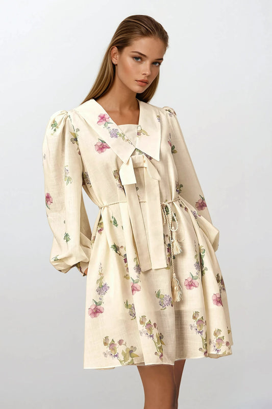 Collared Longsleeves Mini Dress with Floral Pattern - Beige