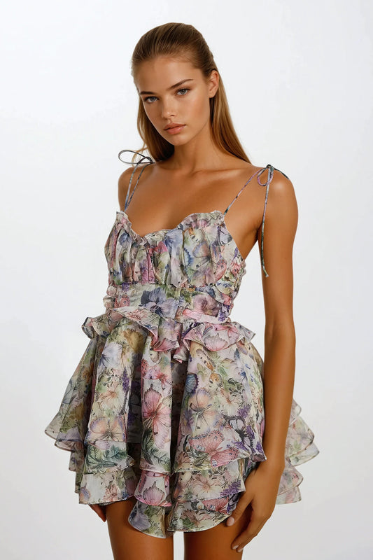 Mini Dress with Ruffled Straps and Layered Skirt - Pink