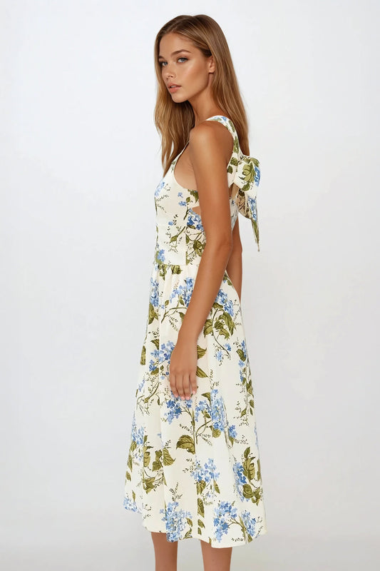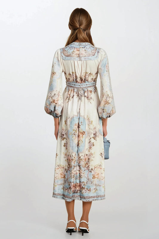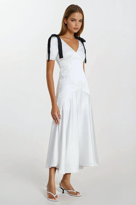 Maxi Dress with Puff Sleeves and Bow Detail - White