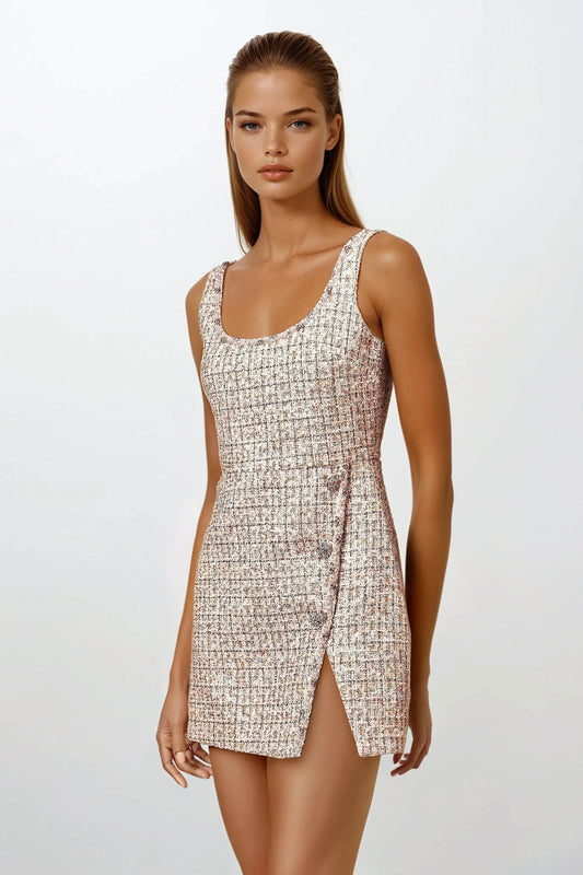 Sleeveless Scoop Neck Mini Dress with Side Slit - Beige