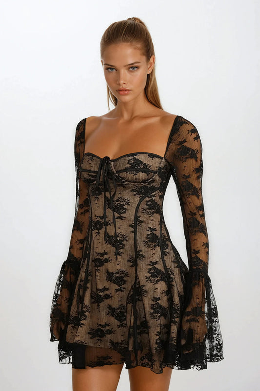 Mini Dress with Sheer Long Sleeves and Lace Details - Black