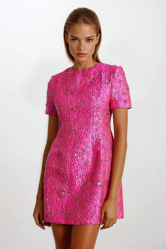 Short Sleeve Floral Embroidered Mini Dress - Pink