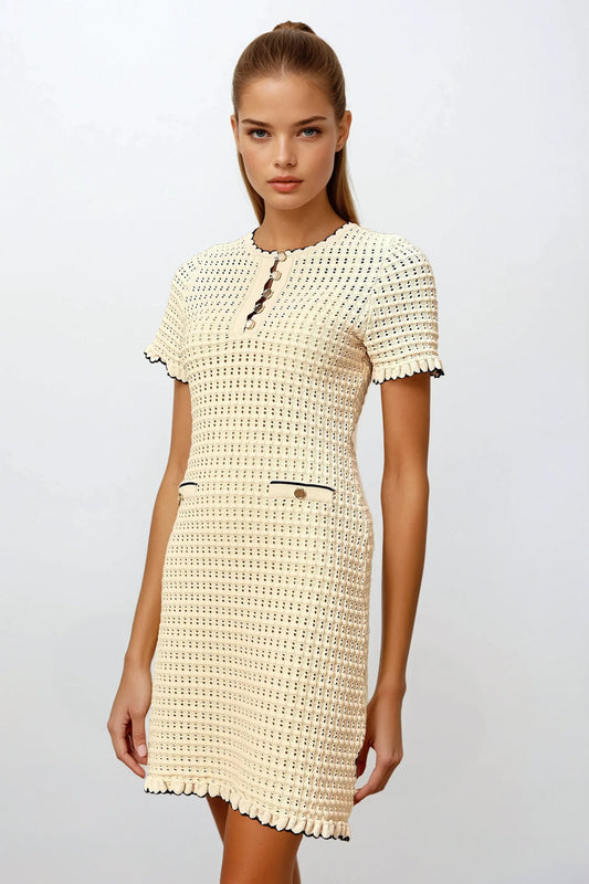 Short Sleeve A-Line Knitted Mini Dress - Beige