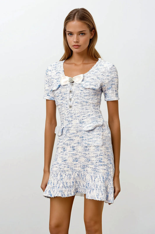 Knitted Mini Dress with Short Sleeves and Front Bow Detail - Blue