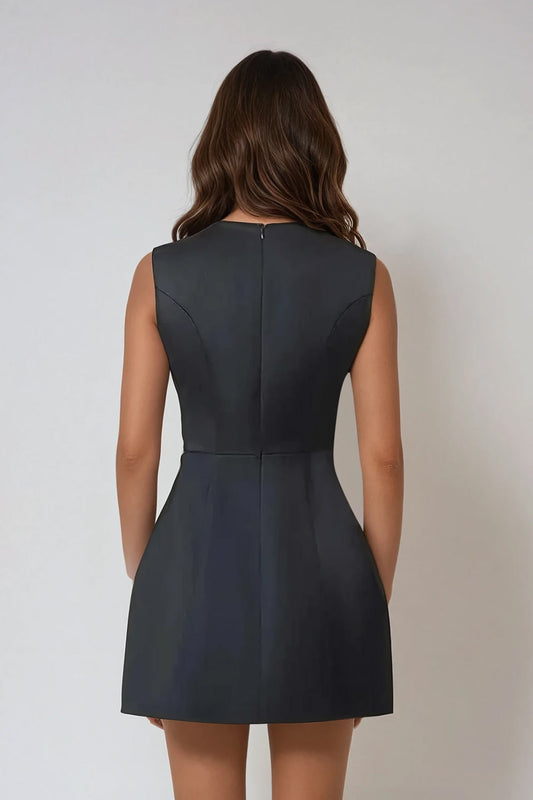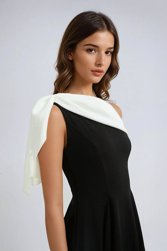 Asymmetrical Mini Dress with Draped Bow Detail - Black