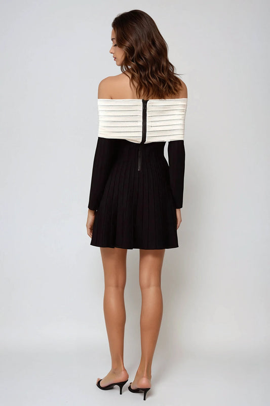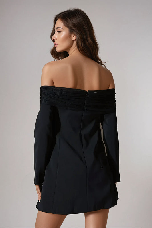 Off-Shoulder Mini Dress with Pleated Design - Black