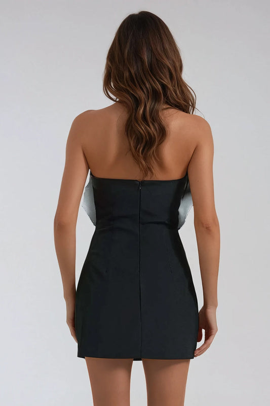 Strapless Mini Dress with Oversized Sequin Flower Accent - Black
