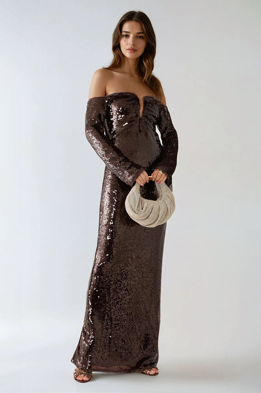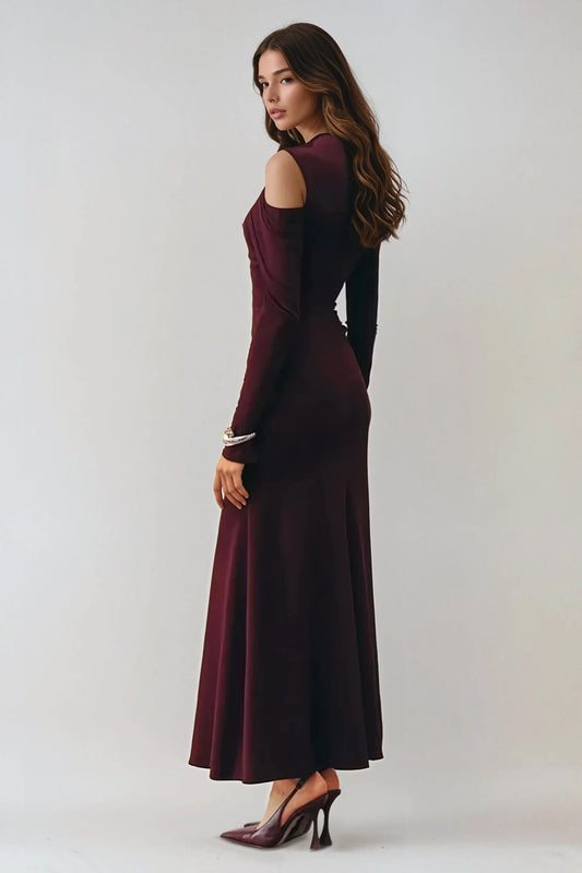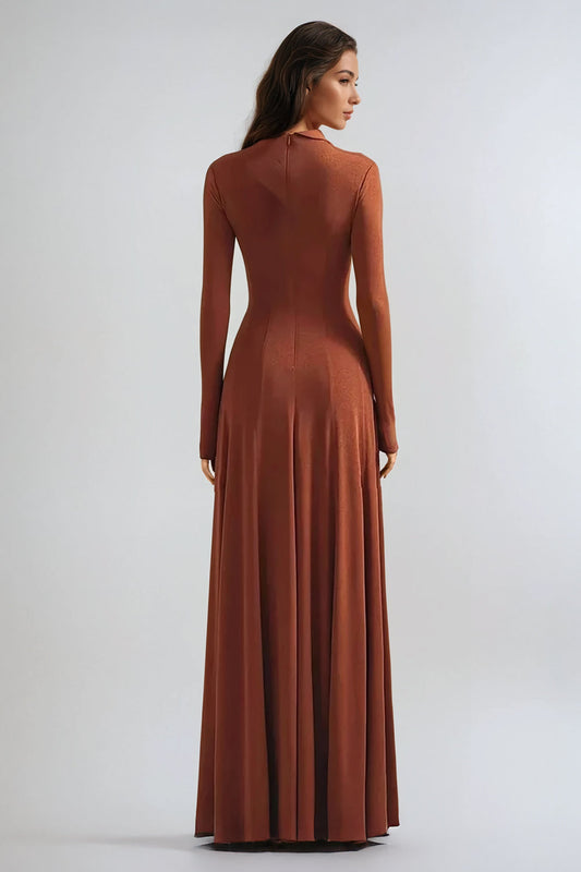 Long Sleeve High-Neck Maxi Dress with Decorative Rose Accent - Brown