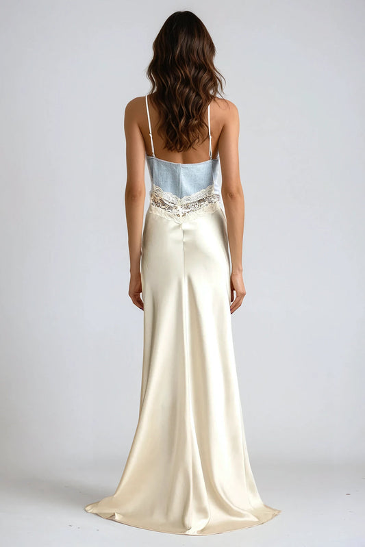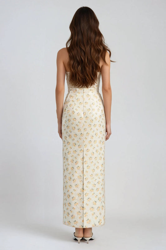 Floral Embroidered Corset Maxi Dress with Spaghetti Straps - White
