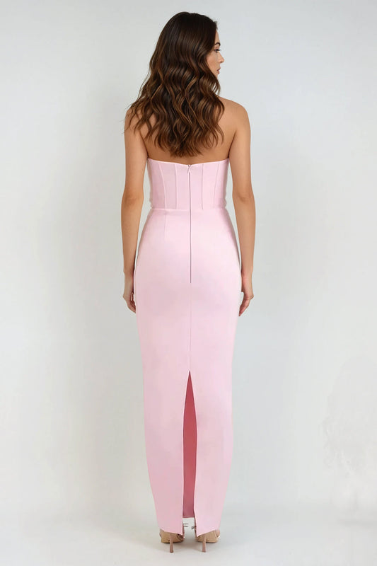Strapless Maxi Dress with 3D Floral Details and Back Slit - Pink