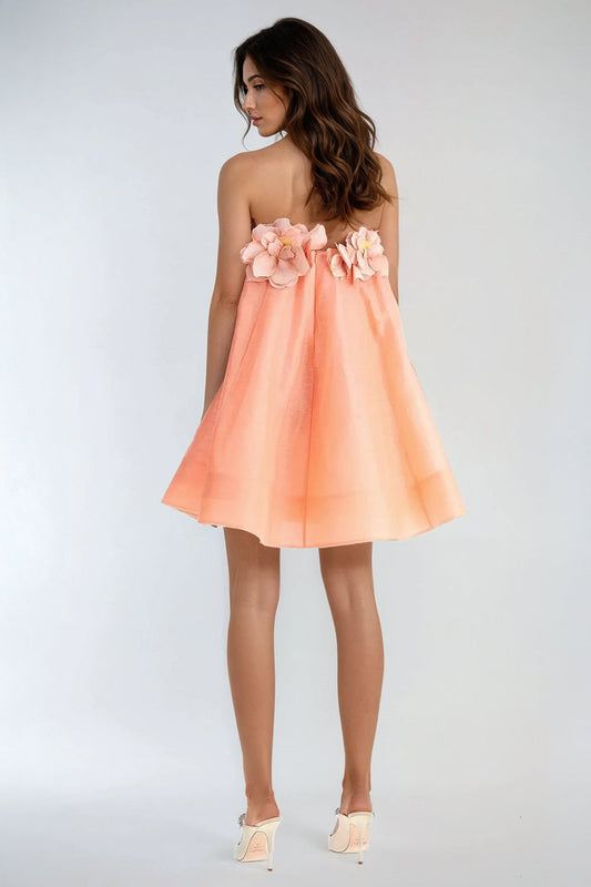 Strapless Mini Dress with Oversized Floral Embellishments - Beige