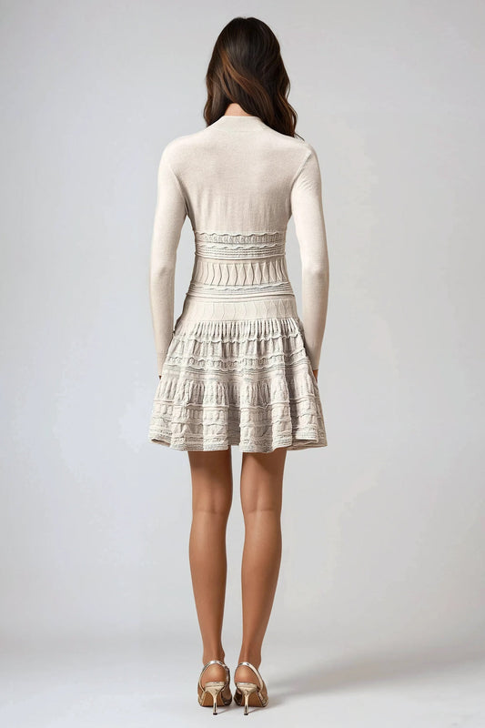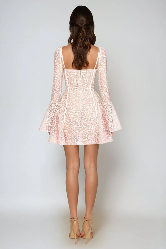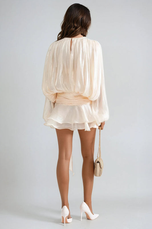 Mini Dress with Lace Overlay and Flared Sleeves - Beige