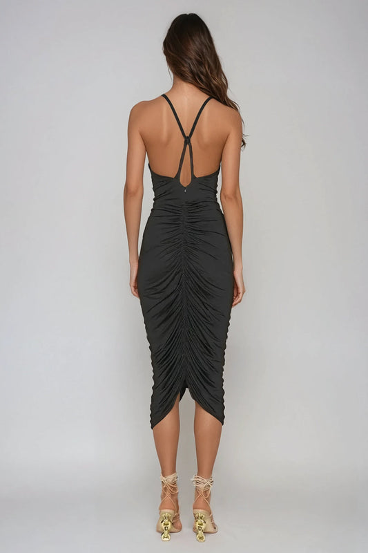 Halter Neck Ruched Midi Dress with Metal Accents - Black