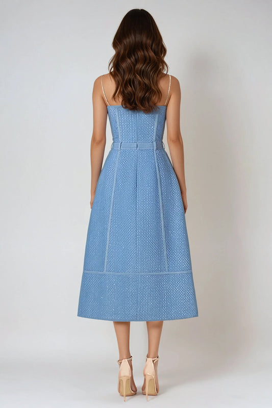 Strapless Denim Midi Dress with Rhinestone Detailing - Blue
