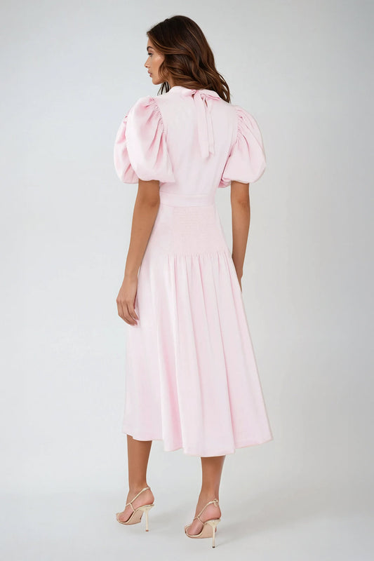 Puff Sleeve Midi Dress with High Neckline and Smocked Waist - Pink