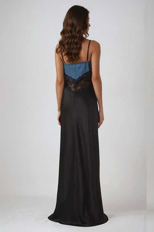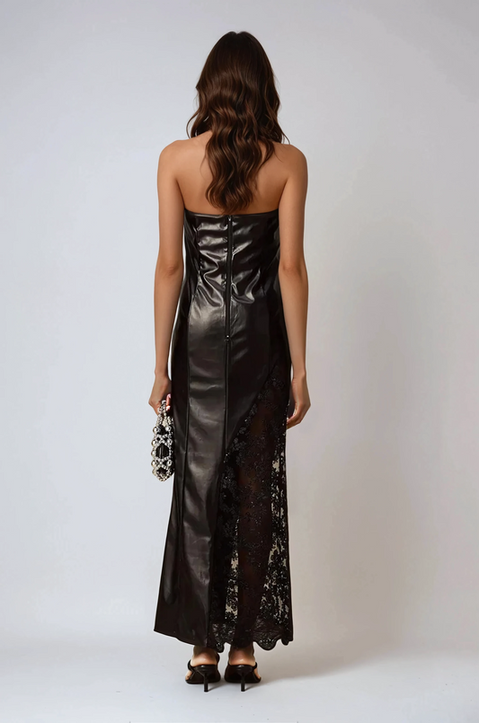 Strapless Leather Maxi Dress with Sheer Lace Panel - Black