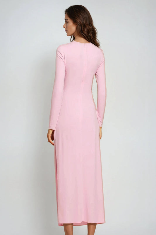 Long Sleeve Midi Dress with Ruched Detail and High Slit - Pink