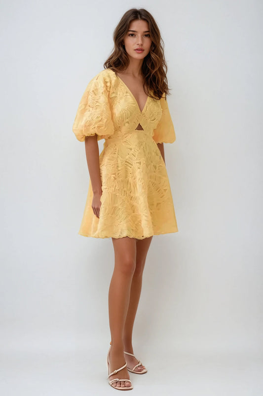 Puff Sleeve Cutout Embroidered Textured Mini Dress - Yellow