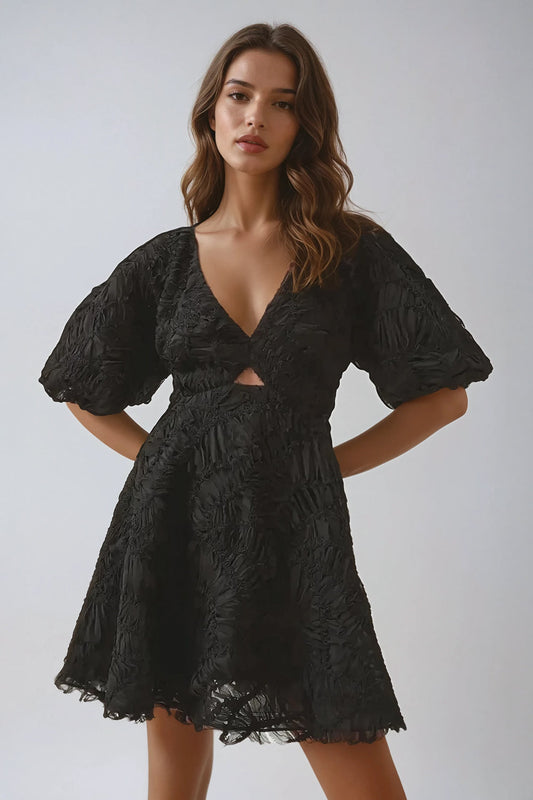 Puff Sleeve Cutout Embroidered Textured Mini Dress - Black