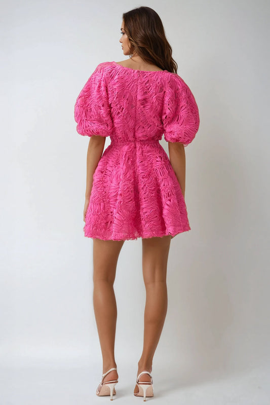 Puff Sleeve Cutout Embroidered Textured Mini Dress - Dark Pink