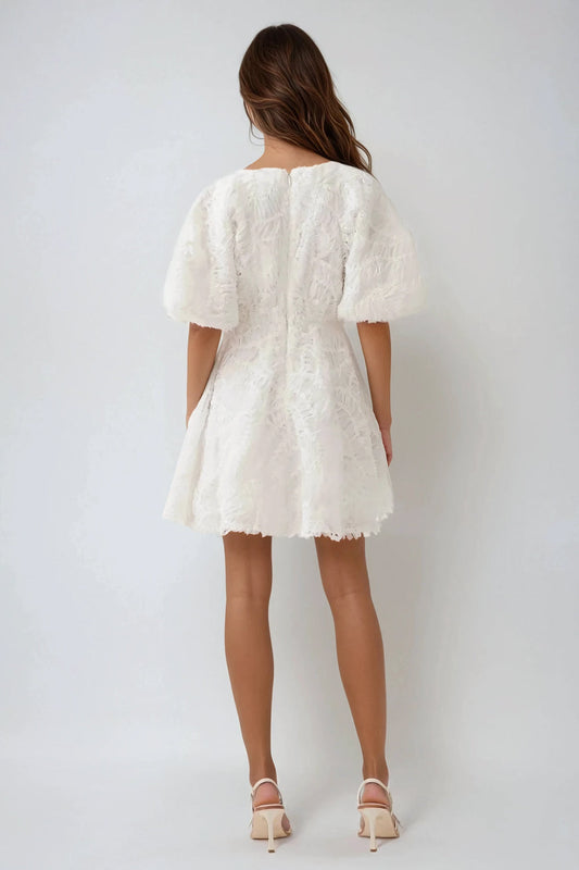 Puff Sleeve Cutout Embroidered Textured Mini Dress - White