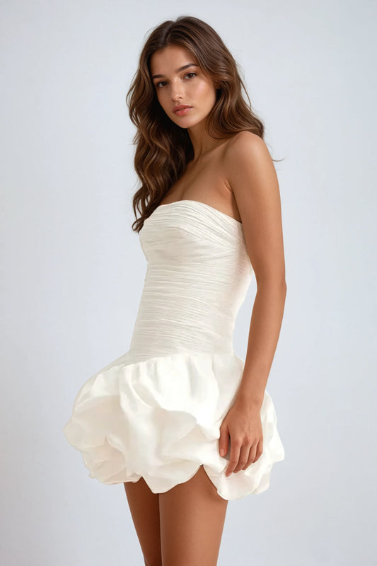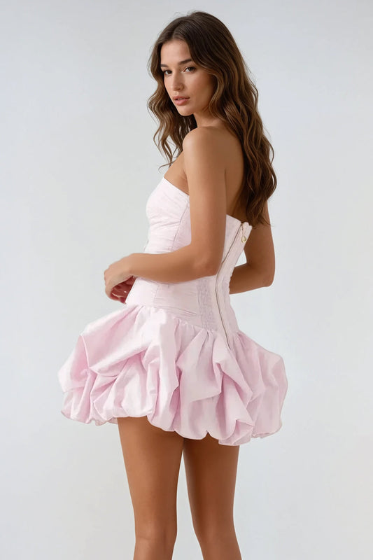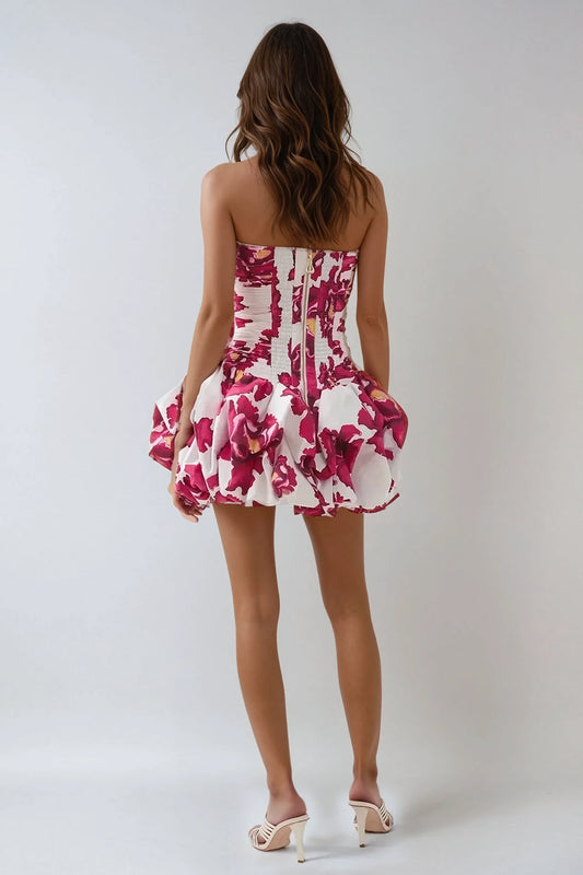 Strapless Floral Bubble Hem Mini Dress - Pink