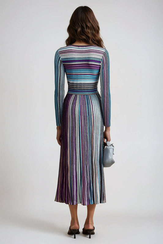 Long Sleeve Maxi Dress with Metallic Stripes Accent - Blue