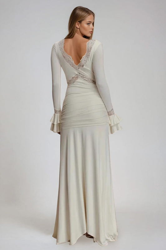 Pleated Trim Sweetheart Neckline Maxi Dress - Beige