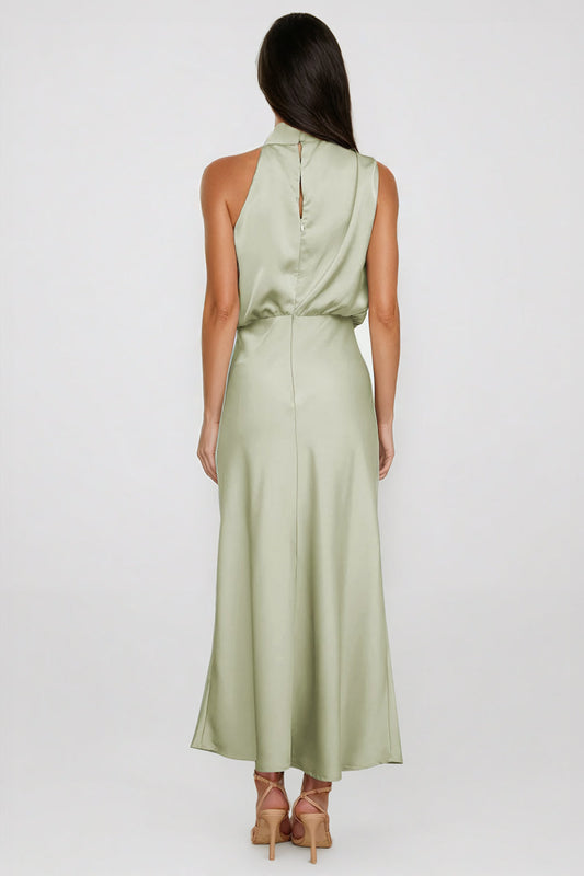 Asymmetrical High-Neck Midi Dress with Draped Bodice - Light Green