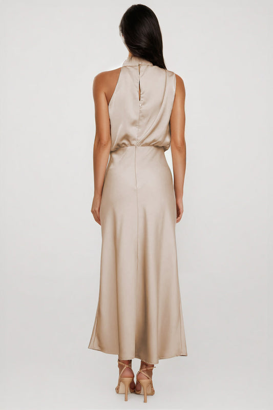 Asymmetrical High-Neck Midi Dress with Draped Bodice - Beige