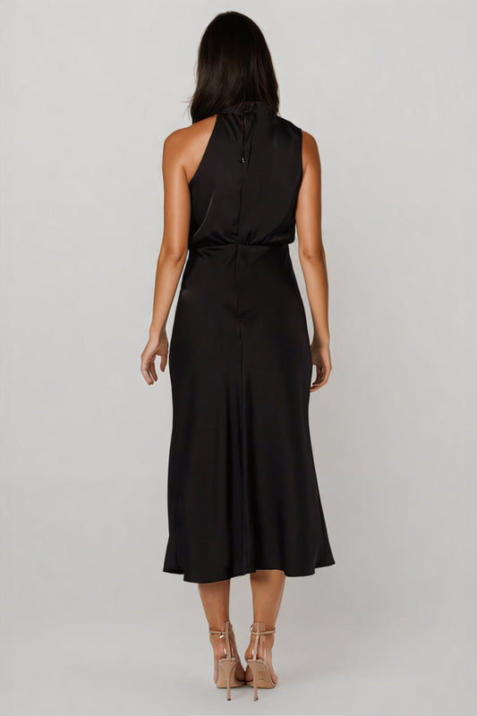 Asymmetrical High-Neck Midi Dress with Draped Bodice - Black