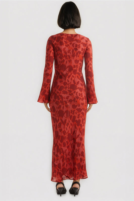 Long-Sleeve Floral Maxi Dress - Red