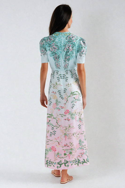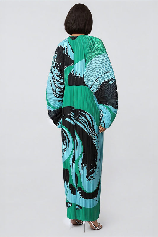 Oversized Sleeve Printed Maxi Dress with Pleated Skirt - Green
