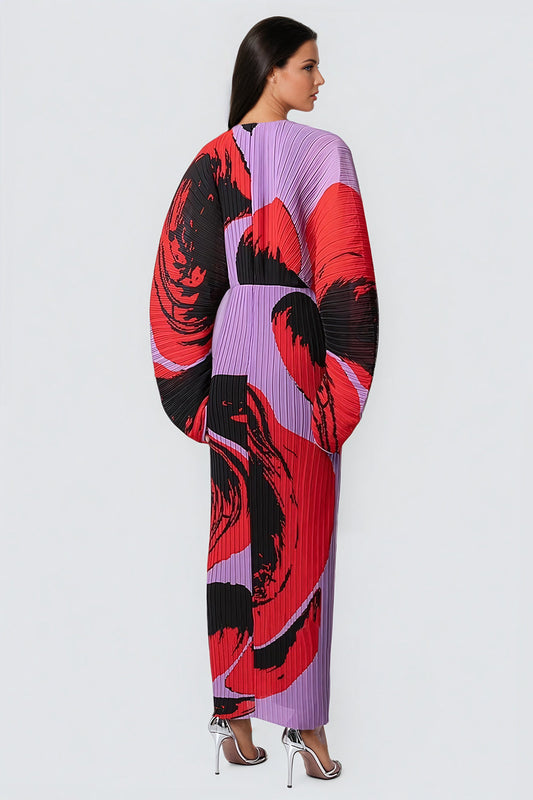 Oversized Sleeve Printed Maxi Dress with Pleated Skirt - Red