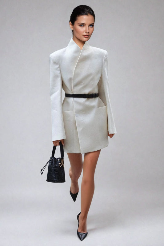 Blazer Style Mini Dress with Stand-Up Collar - White