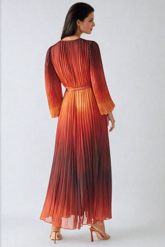 Pleated V-Neck Midi Dress with Belt - Orange
