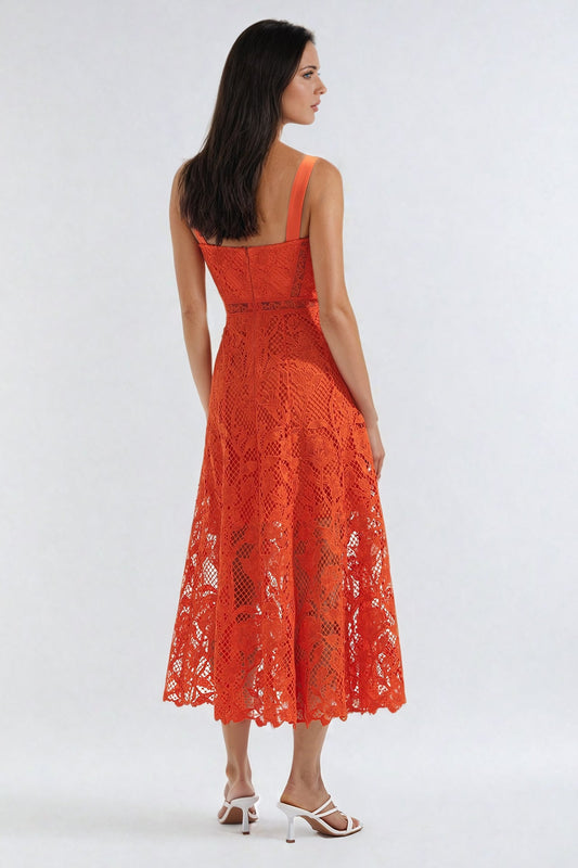 Lace Midi Dress with Sweetheart Neckline - Orange