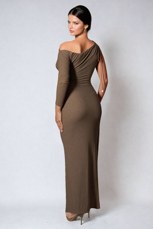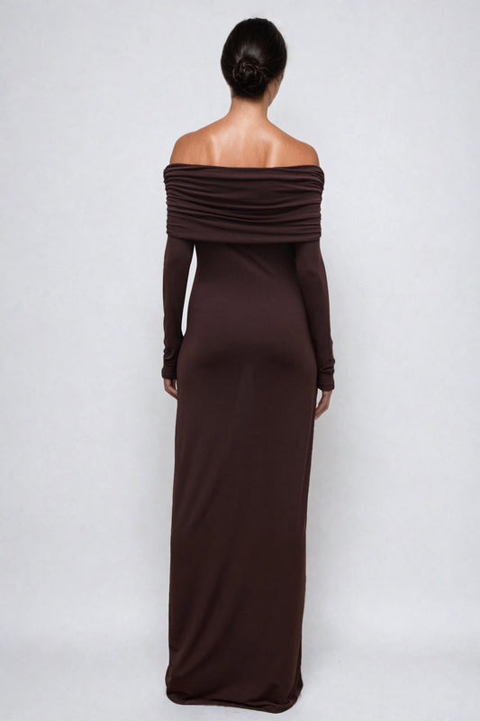 Off-Shoulder Ruched Maxi Dress - Brown