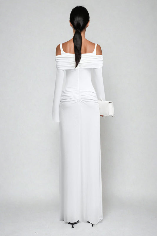 Off-Shoulder Ruched Maxi Dress with Strap Accent - White