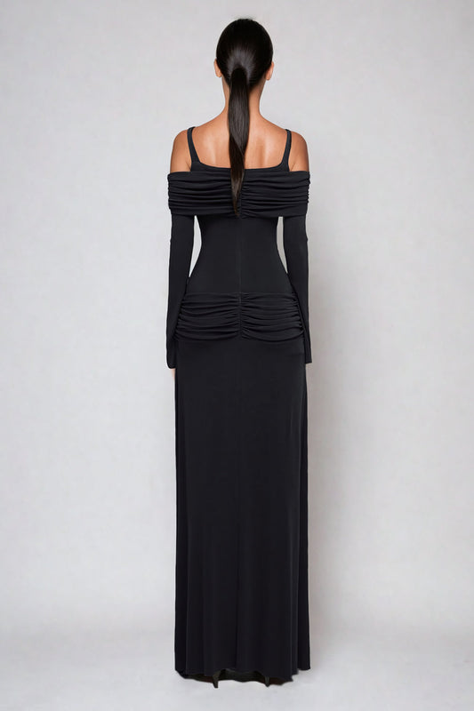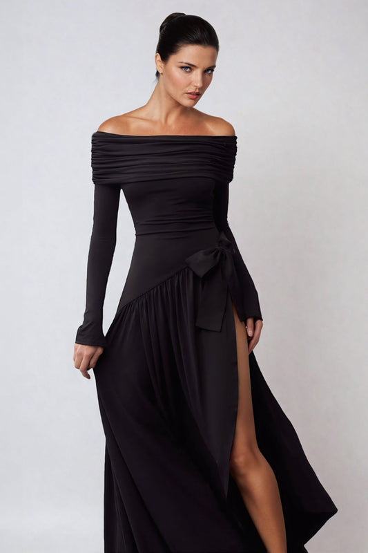Off-Shoulder Draped Maxi Dress with High Slit - Black