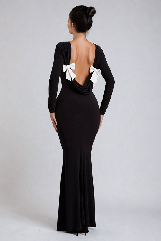 Maxi Dress with Backless with Ribbon - Black
