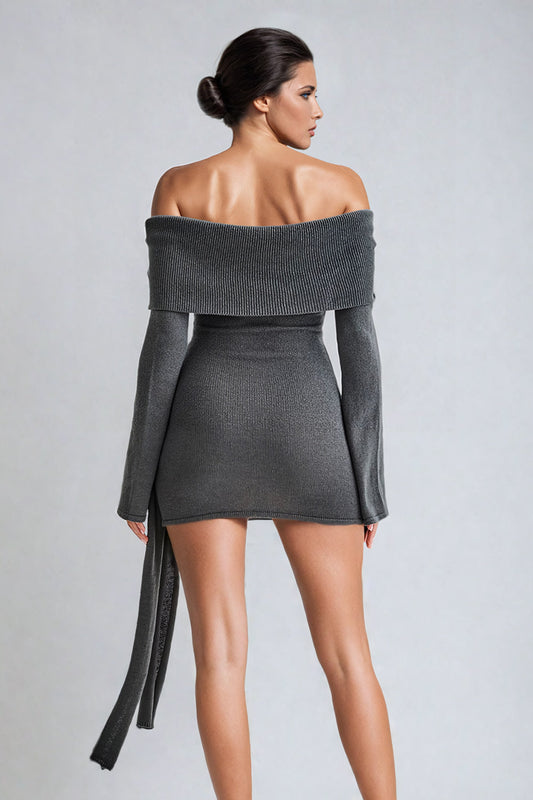Off-Shoulder Tie-Waist Mini Dress - Gray