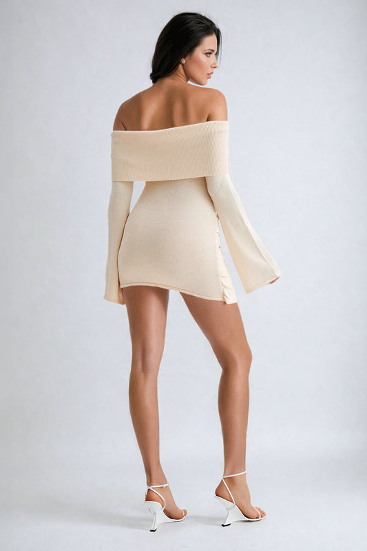 Off-Shoulder Tie-Waist Mini Dress - Beige
