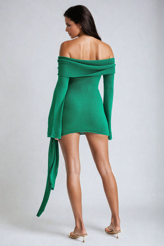 Off-Shoulder Tie-Waist Mini Dress - Green