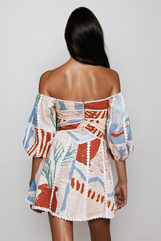 Off-Shoulder Puff Sleeve Printed Mini Dress - White