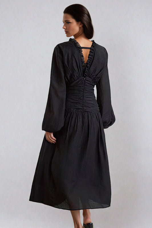 Ruffled V-Neck Cinched Midi Dress - Black
