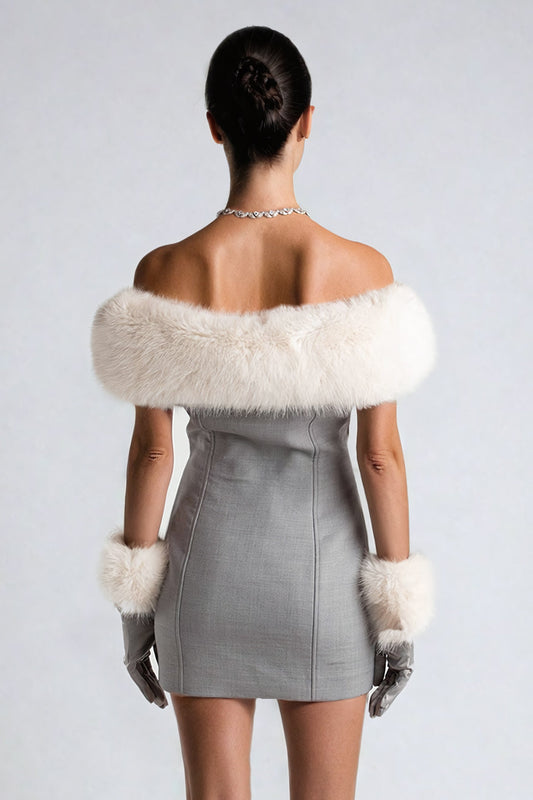 Fur-Trimmed Off-Shoulder Mini Dress - Gray