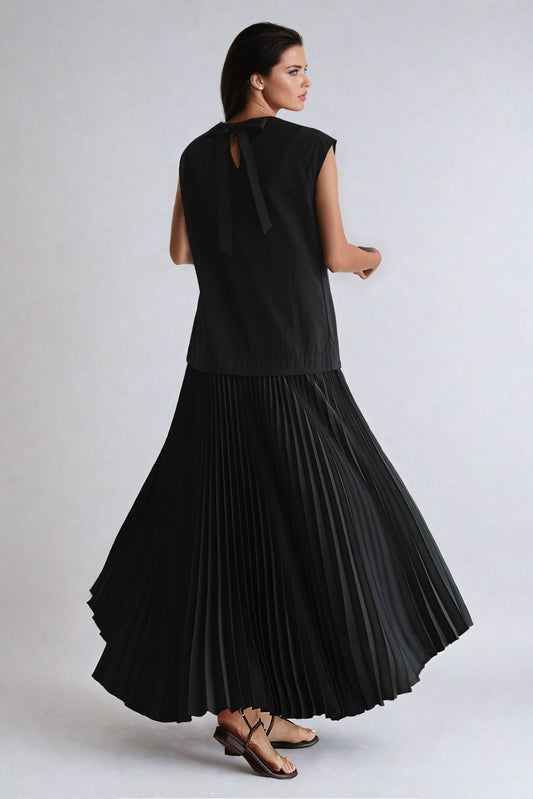 Sleeveless Maxi Dress with Pleated Skirt and Bow Accent - Black