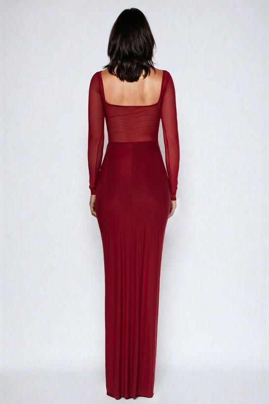 Sheer Sleeve Maxi Dress with Ruched Detailing - Red